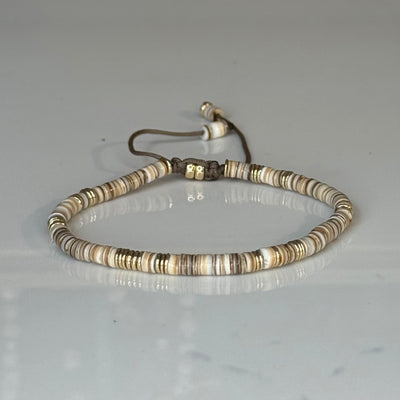 Silver Lining Bracelet in Natural Puka Shell with gold filled Beads on brown Cord