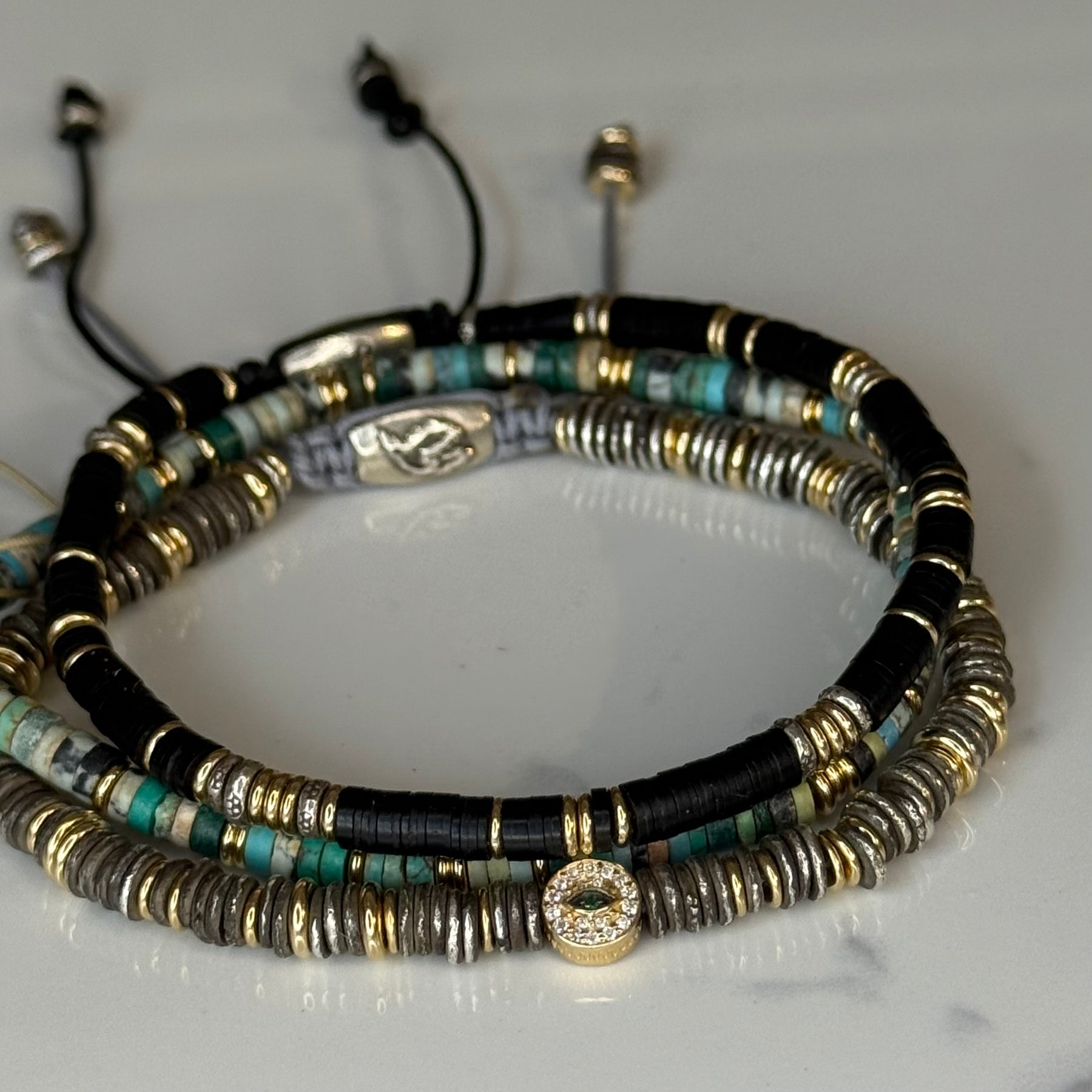 The Silver Lining Bracelet is a unisex piece with our signature adjustable clasp. Vintage black Vinyl yellow Gold filled & sterling sliver spacers. It can be worn layered and stacked within your bracelet collection or as a single strand. This piece is made with an adjustable closure to fit all wrist sizes.