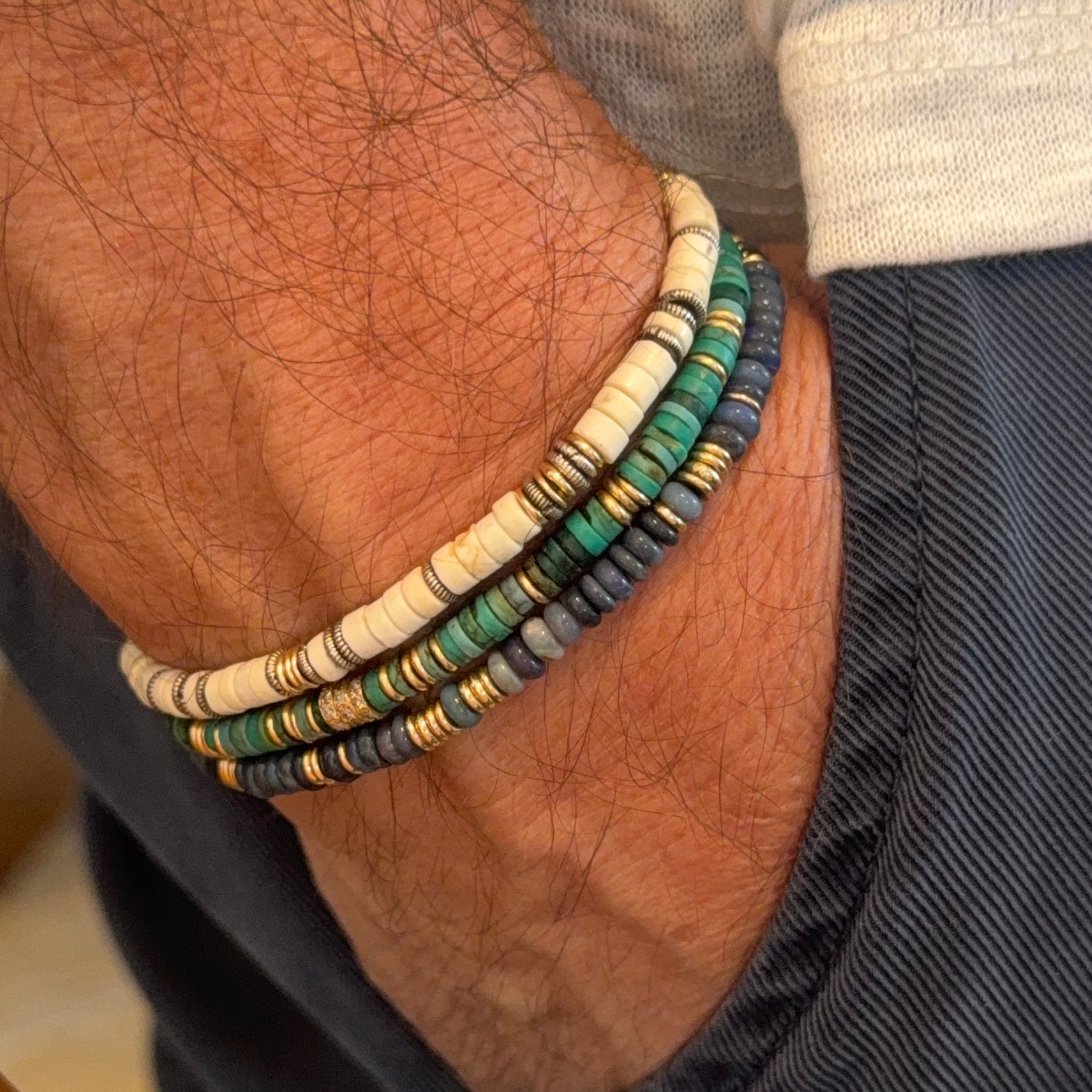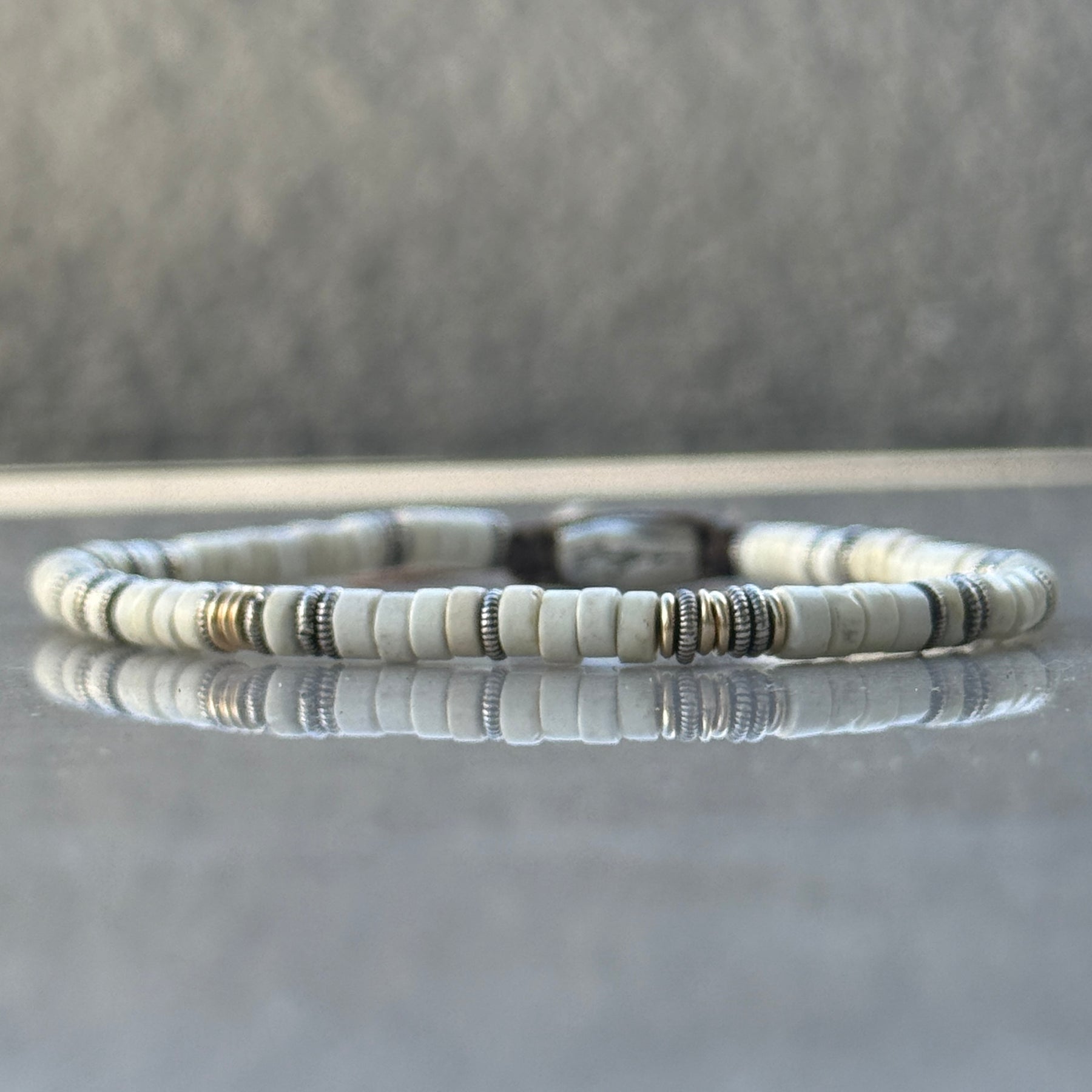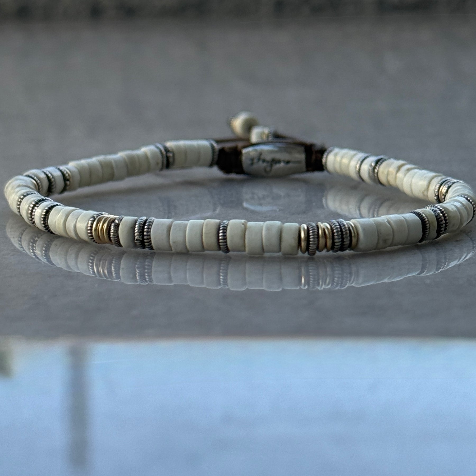 One of our very popular products, silver lining bracelet. Made with white turquoise & sterling silver spacers. Available options to choose your own spacers from gold filled, sterling silver or solid gold.