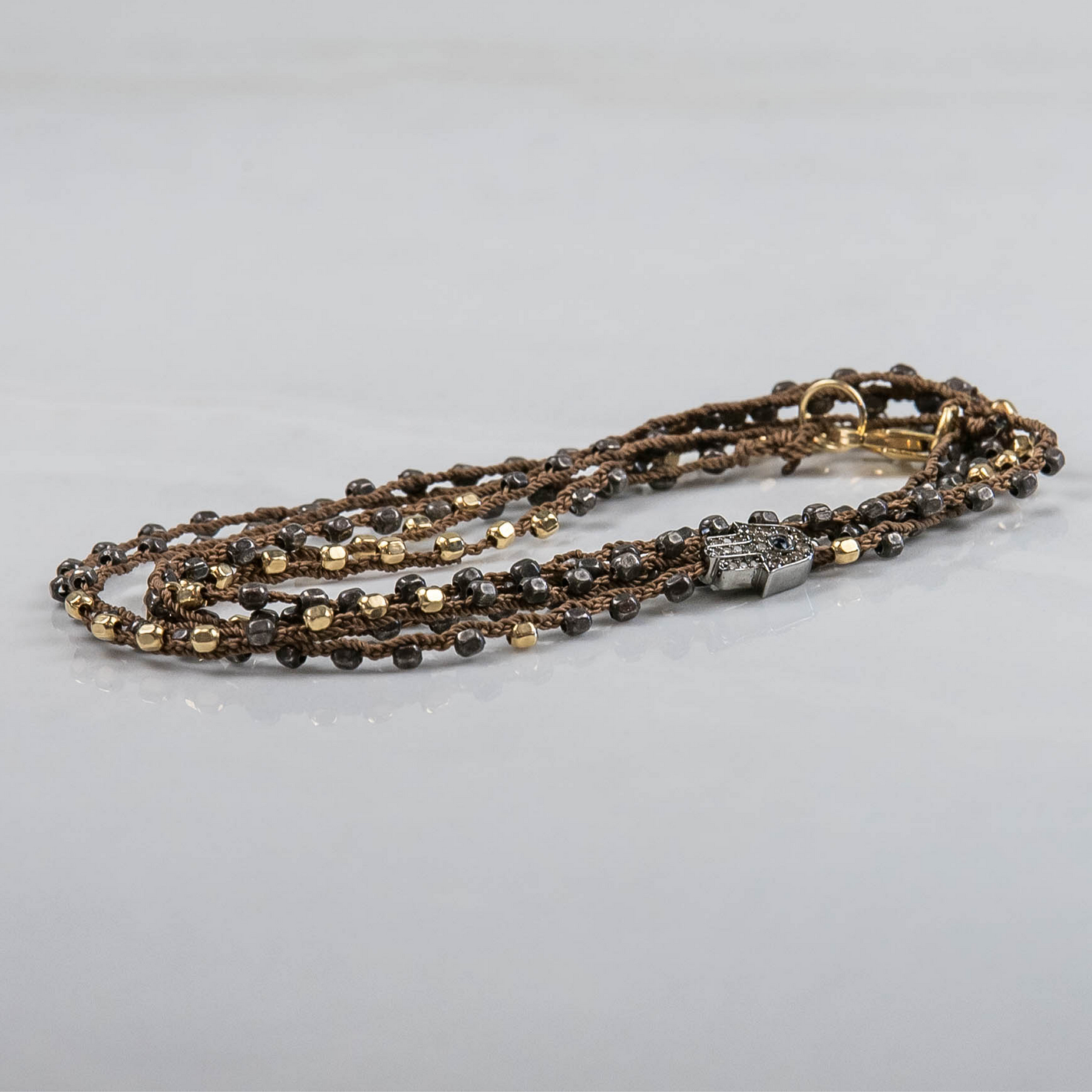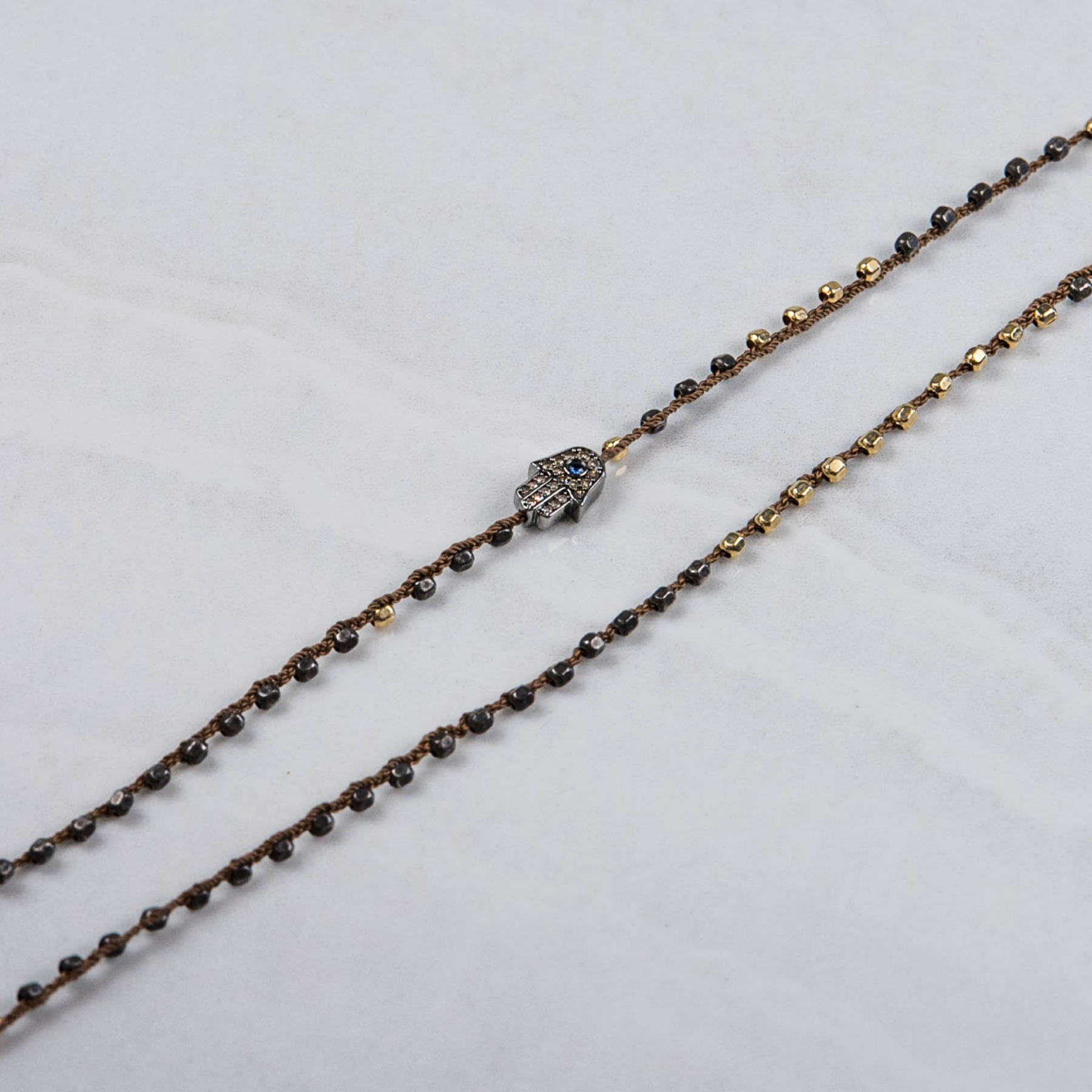 The design incorporates lustrous 14k gold-filled accent beads and is centered around a stunning sterling silver Hamsa charm, which is beautifully detailed with shimmering pavé diamonds and a pop of vibrant sapphire